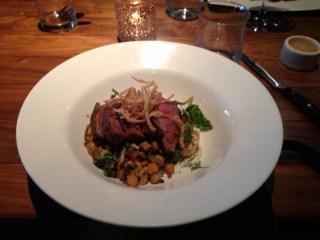 The menu changes often some of the items that my friends and I ordered may not be available. Proof has a lovely selection of of cheeses. We ordered a selection of three cheeses. Everyone really enjoyed a drunken cow cheese that was sublime. I ordered the lamb dish that was done with a Middle Eastern/Mediterranean flair. It was accompanied with chickpeas and a yogurt sauce and topped with delicate onion laces. The flavors were distinct and evoked the a trip to a foreign land with rich and exotic spices. The lamb was cooked to perfection. I really enjoyed my meal. I was not alone.